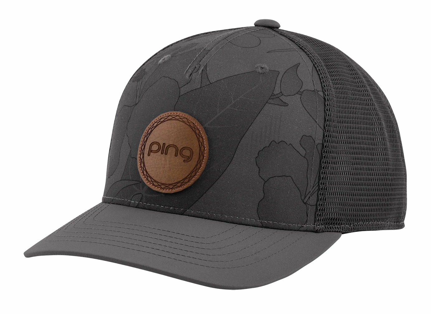 Flora and fauna patterns give the Kona a laidback island vibe. The 100% polyester front panel bears a faux-leather patch, and the stretch poly back panel is mesh — maybe so you can imagine soothing trade winds keeping you cool.